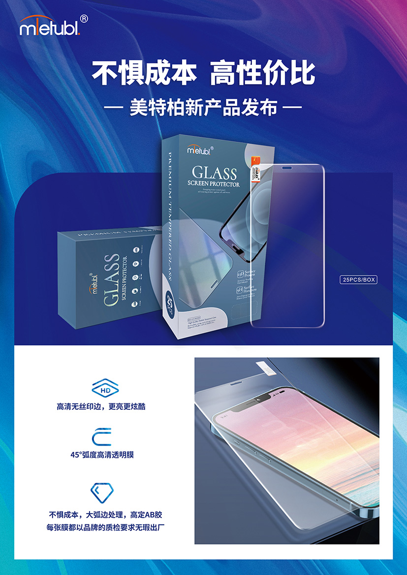 美特柏钢化膜新产品系列,大弧高清钢化膜最新上线。该产品系列立足于为客户提供高性价比的产品。