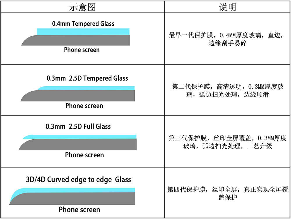 1) 2D指的是传统钢化玻璃膜没有经过边缘抛光处理,我们称之为直边保护膜,此类产品贴合之后,手机握感有扎手的感觉,没有良好的体验,而且边角容易受到撞击破损,现已逐渐被市场淘汰。